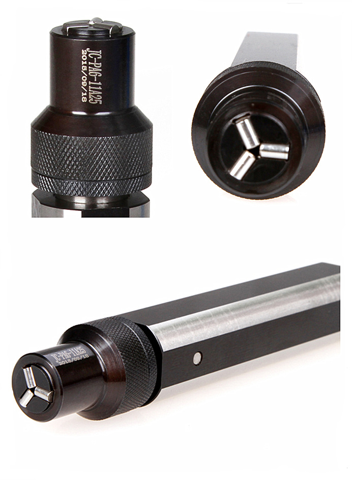 本工具壓力裝置設(shè)計在裝夾柄內(nèi)部,可極大的縮短滾壓頭伸出距離,較適合有行程限制的機(jī)床上平面滾壓加工。